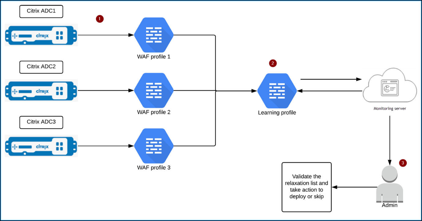 Let us say that you have three appliances in three different DC’s, they each have a WAF profile and this feeds into a learning profile. ADM then offers the admin the option to deploy the rules as is or skip them. It would look like this:
