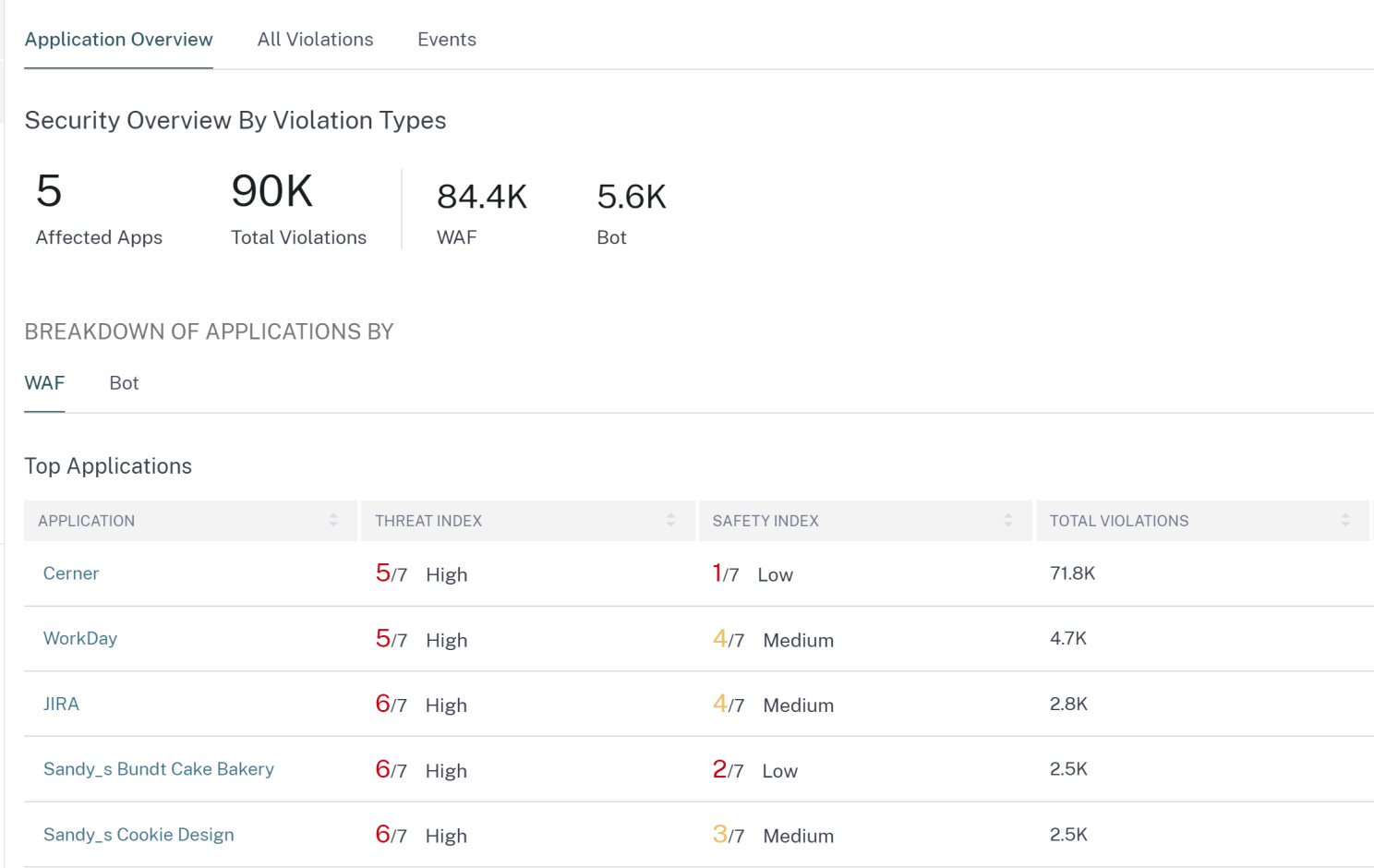 The Threat index shows how bad actors are trying to break in, it will show the specific attack. The safety index is how bad did it get set up in the first place? There is a line for each published application, as they all have their own scores based on their risk.