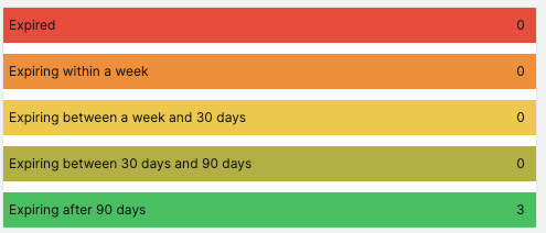 Certificate expiry is a real thing for some companies, they possibly don’t have good processes around their replacement and try to keep on top of things. This view is very useful to see what expiry events are happening in the near future. From this I can see that the next 90 days are clear, the Green colour is a clue! I do have three events that will take place at some point past that.