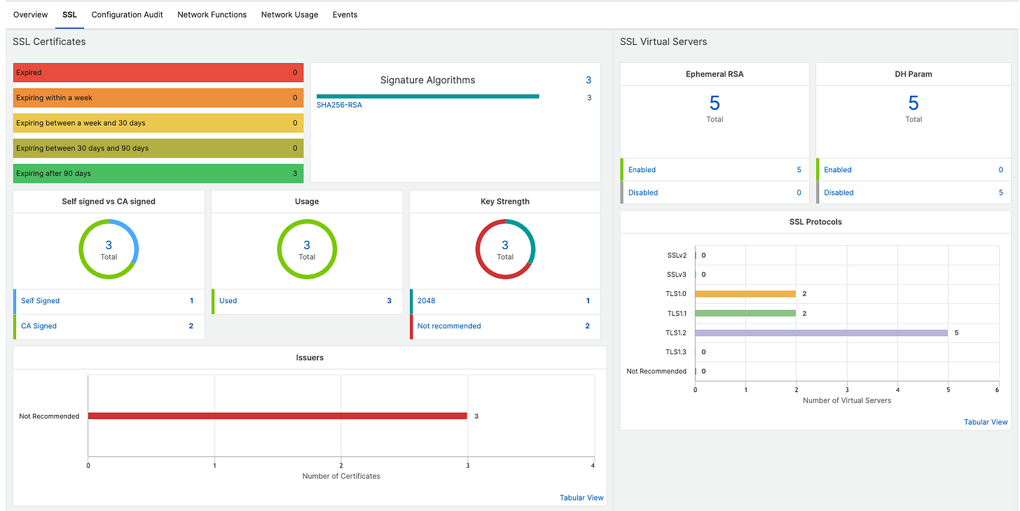 The last piece was one about Infrastructure analytics, in the tab for the instance details, there is a SSL tab. This tab has a customised SSL Dashboard for this specific NetScaler appliance and the certificates that it holds. This test box does not have a lot of use, hence the numbers are quite small. It looks like this: